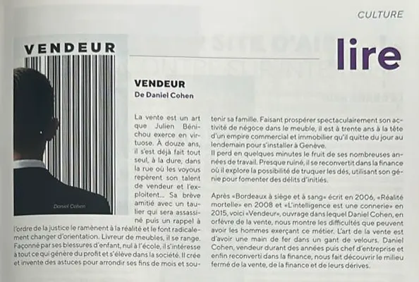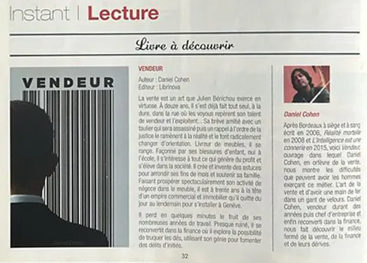 En 2019, il revient à ses premières amours avec Vendeur, quatrième roman dans lequel il sublime un métier souvent mal compris. À travers ce texte, Daniel Cohen rappelle que vendre n’est pas une simple compétence technique, mais bel et bien un art un art qui, selon lui, ne s’enseigne pas.